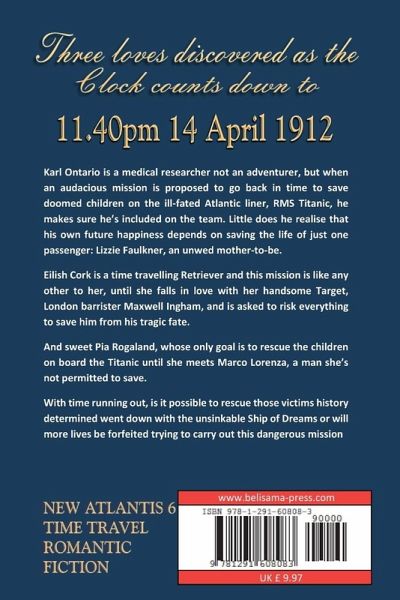 Three loves found on one incredible journey. Karl Ontario is a medical researcher not an adventurer, but when an audacious mission is proposed to go back in time to save doomed children on the ill-fated Atlantic liner, RMS Titanic, he makes sure he's included on the team. Little does he realise that his own future happiness depends on saving the life of just one passenger: Lizzie Faulkner, an unwed mother-to-be. Eilish Cork is a time travelling Retriever and this mission is like any other to her, until she falls in love with her handsome Target, London barrister Maxwell Ingham, and is asked to risk everything to save him from his tragic fate. And sweet Pia Rogaland, whose only goal is to rescue the children on board the Titanic until she meets Marco Lorenza, a man she's not permitted to save. With time running out, is it possible to rescue those victims history determined went down with the unsinkable Ship of Dreams or will more lives be forfeited trying to carry out this dangerous mission.