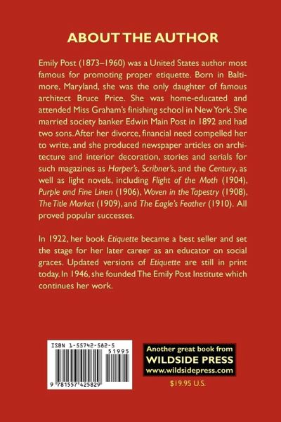 Emily Post (1873-1960) was a United States author who promoted proper etiquette. Born in Baltimore, Maryland, she was the only daughter of famous architect Bruce Price. She was home-educated and attended Miss Graham's finishing school in New York. She married society banker Edwin Main Post in 1892 and had two sons. After her divorce, financial need compelled her to write, and she produced newspaper articles on architecture and interior decoration, stories and serials for such magazines as Harper's, Scribner's, and the Century, as well as light novels, including Flight of the Moth (1904), Purple and Fine Linen (1906), Woven in the Tapestry (1908), The Title Market (1909), and The Eagle's Feather (1910). All proved popular successes. In 1922, her book Etiquette became a best seller and set the stage for her later career as an educator on social graces. Updated versions of Etiquette are still in print today. In 1946, she founded The Emily Post Institute which continues her work.