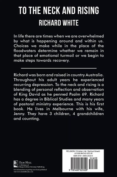 In life there are times when we are overwhelmed by what is happening around and within us. It is like being caught in floodwaters with no way out. King David describes his life this way in Psalm 69. To the neck and rising explores his thoughts, feelings, emotions and attitudes throughout the Psalm. The journey that David takes is not dissimilar to ours and can provide us with valuable personal insights. Choices we make while in the place of the floodwaters determine whether we remain in that place of emotional turmoil or we begin to make steps towards recovery.