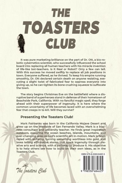 It was pure marketing brilliance on the part of Dr. Ott, a bio-robotic cybernetics scientist, who successfully influenced the school board into replacing all human teachers with his miracle invention of life-like bot-teachers. Is it Real or Robot? Only a few can tell. With this success he moved swiftly to replace all job positions in town. Everyone suffered, as he thrived. To keep his empire running smoothly, Dr. Ott declared certain death on anyone resisting, executing a slight twist of fabricated fear to oppress everyone into giving up, so he can tighten its bone crushing squeeze to suffocate the town. The story begins Christmas Eve on the battlefield where a disruptive band of superheroes stand in defense of their hometown of Beachside Park, California. With no fanciful magic spell, they forge ahead with their superpower of ingenuity. It is here where the common uncertainty of life becomes laced with an overwhelming fear that creeps in to kill. Will they survive? Presenting The Toasters Club! Mark Fairbanks was born in the California Mojave Desert and grew up on the Westside of San Fernando Valley. Mark is a business consultant and university teacher. He finds great inspiration outdoors, exploring the ocean beaches, islands, mountains, and ever-changing skies as God's scientific art in-motion. Mark is fascinated with alchemy, turning something worthless into gold, and loves telling affirmative stories that spark ingenuity through creative arts and science, with a pathway to produce it. His objective is to help others see how to build on their own ideas, as in The Toasters Club.