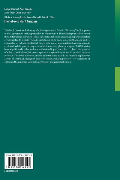 This book describes the history of tobacco genomics, from its "discovery" by Europeans to next-generation omics approaches in plant science. The authors primarily focus on the allotetraploid common tobacco plant (N. tabacum); however, separate chapters are dedicated to closely related Nicotiana species, such as N. benthamiana and N. attenuata, for which substantial progress in omics data analysis has been already achieved. While genetic maps, transcriptomes, and physical maps of BAC libraries have significantly enhanced our understanding of the tobacco plant, the genome of tobacco and related Nicotiana species has opened a new era in modern tobacco research. This book addresses current and future industrial and research applications as well as central challenges in tobacco science, including diseases, low variability of cultivars, the genome's large size, polyploidy, and gene duplication.