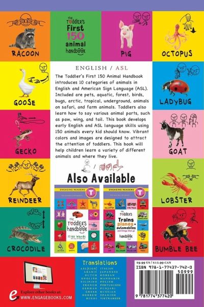 The Toddler's First 150 Animal Handbook introduces 10 categories of animals in English and American Sign Language (ASL). Included are pets, aquatic, forest, birds, bugs, arctic, tropical, underground, animals on safari, and farm animals. Toddlers also learn how to say various animal parts, such as paw, wing, and tail. This book develops early English and ASL language skills using 150 animals every kid should know. Vibrant colors and images are designed to attract the attention of toddlers. This book will help children learn a variety of different animals and where they live.