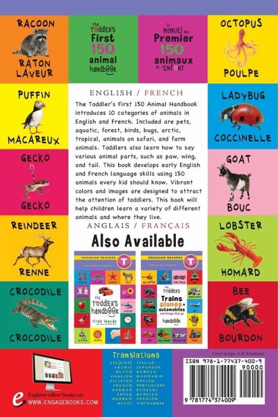 The Toddler's First 150 Animal Handbook introduces 10 categories of animals in English and French. Included are pets, aquatic, forest, birds, bugs, arctic, tropical, underground, animals on safari, and farm animals. Toddlers also learn how to say various animal parts, such as paw, wing, and tail. This book develops early English and French language skills using 150 animals every kid should know. Vibrant colors and images are designed to attract the attention of toddlers. This book will help children learn a variety of different animals and where they live.