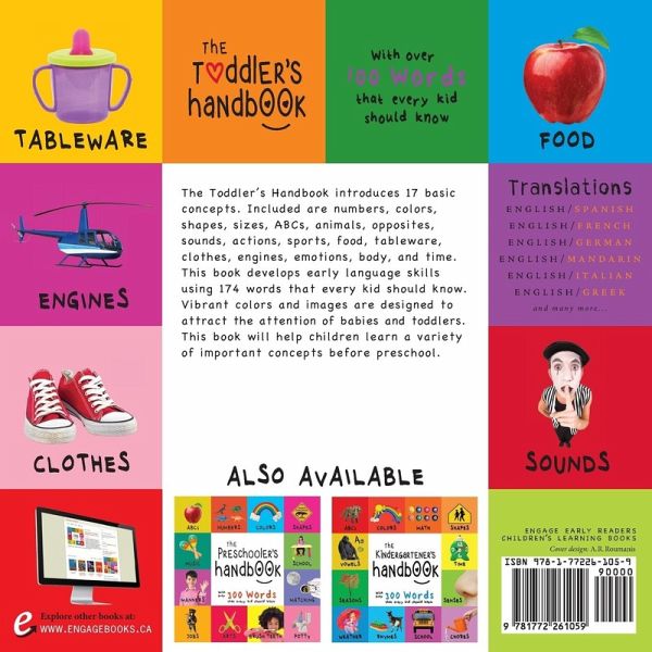 The Toddler's Handbook introduces 17 basic concepts. Included are numbers, colors, shapes, sizes, ABCs, animals, opposites, sounds, actions, sports, food, tableware, clothes, engines, emotions, body, and time. This book develops early language skills using 174 words that every kid should know. Vibrant colors and images are designed to attract the attention of babies and toddlers. This book will help children learn a variety of important concepts before preschool.