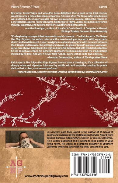 Rick Lupert's 25th collection of poems and latest travelogue written in Japan while visiting Tokyo, Kyoto, and Hiroshima, follows in the footsteps of Richard Brautigan and is loosely inspired by his title The Tokyo-Montana Express. Follow Lupert through Japan with his signature wit and poet's eye as your guide, as he stands in the mysterious "stick line", as indescribable food is put in his mouth (and described anyway), as a monkey crawls on his head, as Hiroshima looms at the end of it all. "One of the smartest, funniest poets around." -Alexis Rhone Fancher, poetry editor, Cultural Weekly, seven-time Pushcart nominee "One of my favorite poets" -Amber Tamblyn, author and actress "Rick Lupert is a writer's chef" - Derrick Brown, poet and publisher, Write Bloody Publishing "I know of no other poet able to establish intimacy with the audience as fast as Rick Lupert." - Brendan Constantine, poet, teacher, Red Hen Press and Write Bloody Publishing. "Rick Lupert is a treasure. His poetry surprises us with a unique perspective that is both tender and wise. In a live environment I find Rick delightfully funny and arrestingly poignant." - Dan Nichols, Touring Jewish Musician "Rick has a voice and style of his own. His take on life will show you things you have never seen or imagined before!" - Craig Taubman, Music Pioneer, Community Organizer
