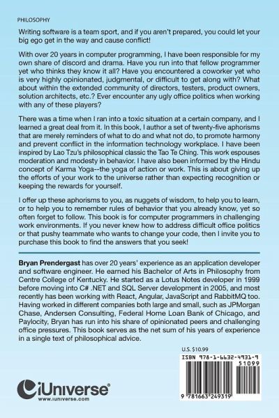 Writing software is a team sport, and if you aren't prepared, you could let your big ego get in the way and cause conflict! With over 20 years in computer programming, I have been responsible for my own share of discord and drama. Have you run into that fellow programmer yet who thinks they know it all? Have you encountered a coworker yet who is very highly opinionated, judgmental, or difficult to get along with? What about within the extended community of directors, testers, product owners, solution architects, etc.? Ever encounter any ugly office politics when working with any of these players? There was a time when I ran into a toxic situation at a certain company, and I learned a great deal from it. In this book, I author a set of twenty-five aphorisms that are merely reminders of what to do and what not do, to promote harmony and prevent conflict in the information technology workplace. I have been inspired by Lao Tzu's philosophical classic the Tao Te Ching. This work espouses moderation and modesty in behavior. I have also been informed by the Hindu concept of Karma Yoga--the yoga of action or work. This is about giving up the efforts of your work to the universe rather than expecting recognition or keeping the rewards for yourself. I offer up these aphorisms to you, as nuggets of wisdom, to help you to learn, or to help you to remember rules of behavior that you already know, yet so often forget to follow. This book is for computer programmers in challenging work environments. If you never knew how to address difficult office politics or that pushy teammate who wants to change your code, then I invite you to purchase this book to find the answers that you seek!