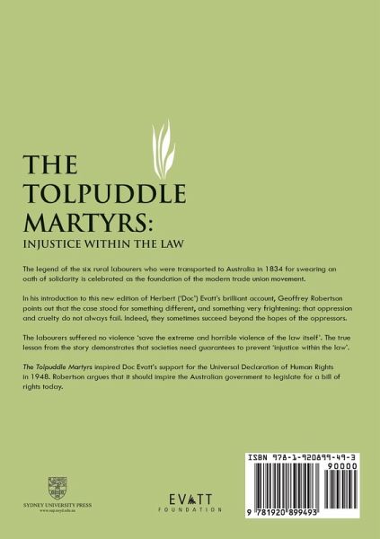 The legend of the six rural labourers who were transported to Australia in 1834 for swearing an oath of solidarity is celebrated as the foundation of the modern trade union movement. In his introduction to this new edition of Herbert ('Doc') Evatt's brilliant account, Geoffrey Robertson points out that the case stood for something different, and something very frightening: that oppression and cruelty do not always fail. Indeed, they sometimes succeed beyond the hopes of the oppressors. The labourers suffered no violence 'save the extreme and horrible violence of the law itself'. The true lesson from the story demonstrates that societies need guarantees to prevent 'injustice within the law'. The Tolpuddle Martyrs inspired Doc Evatt's support for the Universal Declaration of Human Rights in 1948. Robertson argues that it should inspire the Rudd Labor government to legislate for a bill of rights in Australia today.