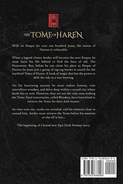With no Keeper for over one hundred years, the nation of Narean is vulnerable. When a legend claims Aeidor will become the next Keeper, he must leave his life behind to find the hero of old, The Huntsman. But, before he can claim his place as Keeper of Narean he must join a group of rag-tag heroes in search for the mythical Tome of Haren. A book of magic that has the power to shift the tide in a war brewing. On his harrowing journey he must endure horrors, visit marvellous wonders, and delve deep within a cursed city where death lies in wait. However, they are not the only ones seeking the Tome. Feral mercenaries, called Blooders, have been hired to retrieve the Tome for their dark master. As time runs out, truths are revealed, and his enemies close in around him, Aeidor must retrieve the Tome before his enemies or else all is lost... The beginning of a brand new Epic Dark Fantasy story.