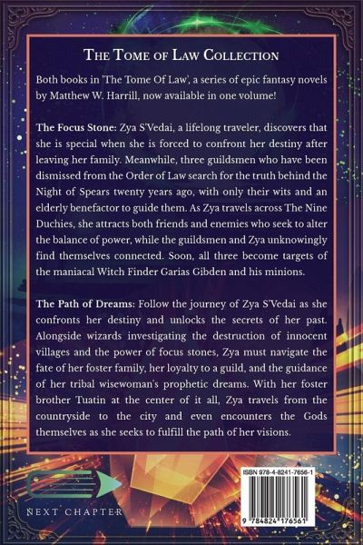 Both books in 'The Tome Of Law', a series of epic fantasy novels by Matthew W. Harrill, now available in one volume! The Focus Stone: Zya S'Vedai, a lifelong traveler, discovers that she is special when she is forced to confront her destiny after leaving her family. Meanwhile, three guildsmen who have been dismissed from the Order of Law search for the truth behind the Night of Spears twenty years ago, with only their wits and an elderly benefactor to guide them. As Zya travels across The Nine Duchies, she attracts both friends and enemies who seek to alter the balance of power, while the guildsmen and Zya unknowingly find themselves connected. Soon, all three become targets of the maniacal Witch Finder Garias Gibden and his minions. The Path of Dreams: Follow the journey of Zya S'Vedai as she confronts her destiny and unlocks the secrets of her past. Alongside wizards investigating the destruction of innocent villages and the power of focus stones, Zya must navigate the fate of her foster family, her loyalty to a guild, and the guidance of her tribal wisewoman's prophetic dreams. With her foster brother Tuatin at the center of it all, Zya travels from the countryside to the city and even encounters the Gods themselves as she seeks to fulfill the path of her visions.