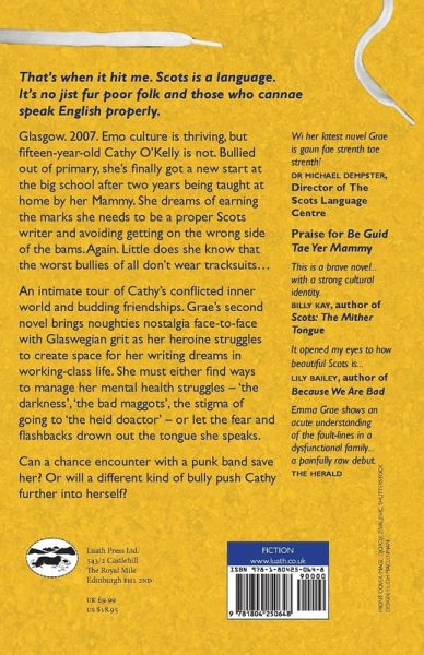 Glasgow. 2007. Emo culture is thriving, but fifteen-year-old Cathy O'Kelly is not. Bullied out of primary, she's finally got a new start at the big school after two years being taught at home by her Mammy. She dreams of earning the marks she needs to be a proper Scots writer and avoiding getting on the wrong side of the bams. Again. Little does she know that the worst bullies of all don't wear tracksuits... An intimate tour of Cathy's conflicted inner world and budding friendships. Grae's second novel brings noughties nostalgia face-to-face with Glaswegian grit as her heroine struggles to create space for her writing dreams in working-class life. She must either find ways to manage her mental health struggles - 'the darkness', 'the bad maggots', the stigma of going to 'the heid doactor' - or let the fear and flashbacks drown out the tongue she speaks. Can a chance encounter with a punk band save her? Or will a different kind of bully push Cathy further into herself?