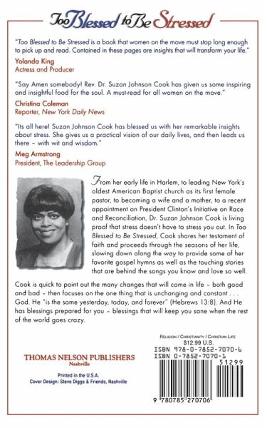 In Too Blessed to Be Stressed Dr. Suzan Johnson Cook shares her testament of faith and is living proof that stress doesn't have to stress you out. Dr. Cook uses her platform as the first female American Baptist pastor, a wife, a mother, as well as an appointee to President Clinton's Initiative on Race and Reconciliation to point out that many changes in life will happen - both good and bad. There is one constant that we can count on in this change-the unchanging and constant nature of God. Dr. Cook provides stories and hymns to show that God has blessings prepared for each and every women in their season of life.