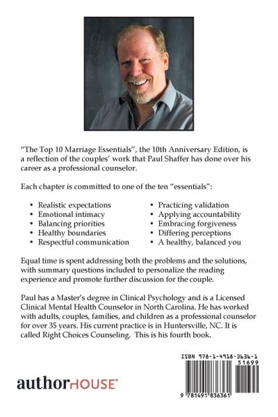 "The Top 10 Marriage Essentials" is a reflection of the couples' work that Paul Shaffer has done over his lengthy career as a professional counselor. Moving past his books on couple's conflict resolution, "Marriage Essentials" addresses ten of the most common dilemmas that chronically show themselves in marriages: realistic role expectations creating true intimacy keeping the marriage as a priority maintaining healthy boundaries fostering respect practicing validation exercising loving accountability embracing forgiveness dealing with differing perceptions a healthy you Equal time is spent addressing both the problem and the solutions, with summary questions included to personalize the reading experience and promote further discussion for the couple.