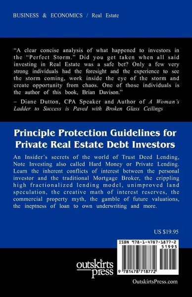 How to Protect you Principle and Succeed in Off Wall Street Investing for Secured High Yields An insider's secrets of the world of Trust Deed and Mortgage Lending also called Hard Money or Private Lending. Learn the pitfalls of the industry from the inside; the inherent conflicts of interest between the investors and the Mortgage Broker, the crippling high fractionalized lending model, unimproved land speculation, the creative math of interest reserves, the commercial property myth, the gamble of future valuations, the ineptness of loan to own underwriting and to name a few. One of the major differences between the financial crisis on Wall Street and the private Trust Deed's is that most of the pitfalls can be identified, mitigated or avoided by investors prior to investing. With this book anyone can learn to position themselves to diversify their portfolio away from the turmoil and lack of transparency of Wall Street. Potential investors should be looking for high yields with the safety of simple, secured investments.