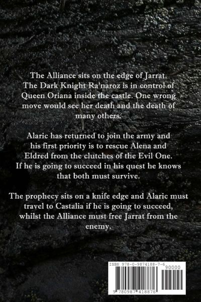 The Alliance sits on the edge of Jarrat. The Dark Knight Ra'naroz is in control of Queen Oriana inside the castle. One wrong move would see her death and the death of many others. Alaric has returned to join the army and his first priority is to rescue Alena and Eldred from the clutches of the Evil One. If he is going to succeed in his quest he knows that both must survive. The prophecy sits on a knife edge and Alaric must travel to Castalia if he is going to succeed, whilst the Alliance must free Jarrat from the enemy.