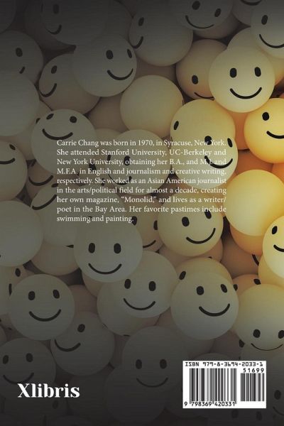Carrie Chang was born in 1970, in Syracuse, New York. She attended Stanford University, UC-Berkeley and New York University, obtaining her B.A., and M.J. and M.F.A. in English and journalism and creative writing, respectively. She worked as an Asian American journalist in the arts/political field for almost a decade, creating her own magazine, "Monolid," and lives as a writer/poet in the Bay Area. Her favorite pastimes include swimming and painting.