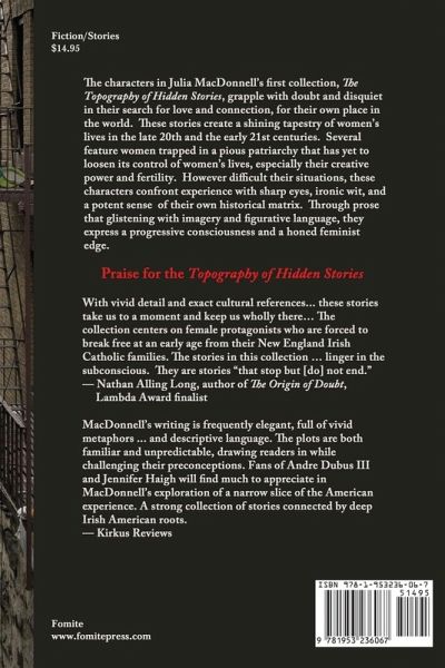 The characters in Julia MacDonnell's first collection, The Topography of Hidden Stories, grapple with doubt and disquiet in their search for love and connection, for their own place in the world, and create a shining tapestry of women's lives in the late 20th and the early 21st centuries. Several feature women trapped in a pious patriarchy that has yet to loosen its control of women's lives, especially their creative power and fertility. However difficult their situations, these characters confront experience with sharp eyes, ironic wit, and a potent sense of their own historical matrix. Through prose that glistening with imagery and figurative language, they express a progressive consciousness and a honed feminist edge.