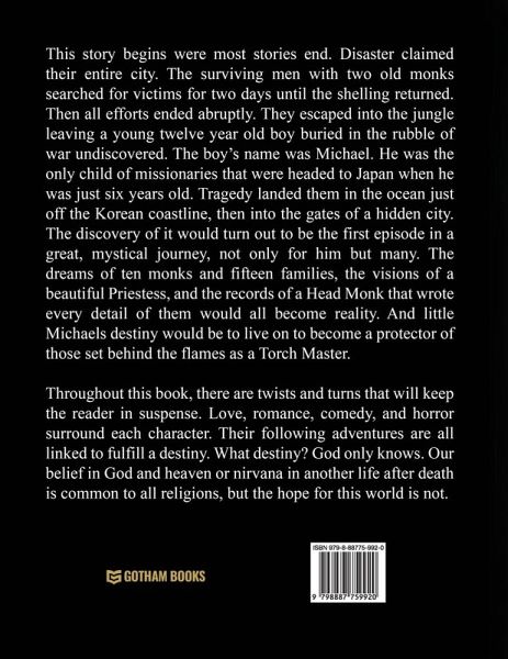 This story begins were most stories end. Disaster claimed their entire city. The surviving men with two old monks searched for victims for two days until the shelling returned. Then all efforts ended abruptly. They escaped into the jungle leaving a young twelve year old boy buried in the rubble of war undiscovered. The boy's name was Michael. He was the only child of missionaries that were headed to Japan when he was just six years old. Tragedy landed them in the ocean just off the Korean coastline, then into the gates of a hidden city. The discovery of it would turn out to be the first episode in a great, mystical journey, not only for him but many. The dreams of ten monks and fifteen families, the visions of a beautiful Priestess, and the records of a Head Monk that wrote every detail of them would all become reality. And little Michaels destiny would be to live on to become a protector of those set behind the flames as a Torch Master. Throughout this book, there are twists and turns that will keep the reader in suspense. Love, romance, comedy, and horror surround each character. Their following adventures are all linked to fulfill a destiny. What destiny? God only knows. Our belief in God and heaven or nirvana in another life after death is common to all religions, but the hope for this world is not.
