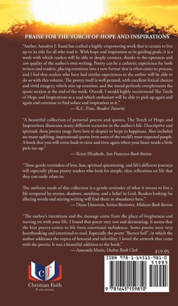 "Author Annalyn J. Rasul has crafted a highly empowering work that is certain to live up to its title for all who read it. With hope and inspiration as its guiding goals, it is a work with which readers will be able to deeply connect, thanks to the openness and raw quality of the author's own writing. Poetry can be a cathartic experience for both writers and readers, placing emotions into a new format that is often easier to process, and I feel that readers who have had similar experiences to the author will be able to do so with this volume. The poetry itself is well penned, with excellent lexical choices and vivid imagery, which stirs up emotion, and the mood perfectly complements the quote section at the end of the work. Overall, I would highly recommend The Torch of Hope and Inspirations as a read which enthusiast will be able to pick up again and again and continue to find solace and inspiration in it." - K.C. Finn, Readers' Favorite "A beautiful collection of personal poems and quotes, The Torch of Hope and Inspirations illustrates many different scenarios in the author's life. Descriptive and spiritual, these poems range from love to despair to hope to happiness. Also included are many uplifting, inspirational quotes from some of the world's most respected people. A book that you will come back to time and time again when your heart needs a little pick-me-up." - Kristi Elizabeth, San Francisco Book Review "These gentle reminders of love, loss, spiritual questioning, and life's different journeys will especially please poetry readers who look for simple, clear reflections on life that they can easily relate to. The uniform result of this collection is a gentle reminder of what it means to live a life tempered by storms, shadows, sunshine, and a belief in God. Readers looking for alluring words and stirring writing will find them in abundance here." - Diane Donovan, Senior Reviewer, Midwest Book Review "The author's intentions and the message come from the place of forgiveness and moving on with your life. I found that poem very raw and devastating. It seems that the best poetry comes to life from emotional turbulence. Some poems were very heartbreaking and emotional to read. Especially the poem "Barren Soil", in which the author addresses the topics of betrayal and infertility. I loved the artwork that came with the poems. It was a beautiful addition to the book." - Antonela Maria, Online Book Club