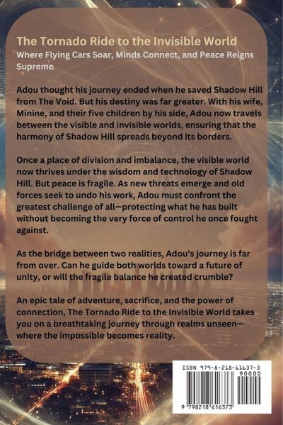 The Tornado Ride to the Invisible World Where Flying Cars Soar, Minds Connect, and Peace Reigns Supreme In a world where technology and nature exist in perfect harmony, flying cars glide through the skies, people communicate through thought, and long-distance travel is achieved in an instant. Shadow Hill is a utopia unlike any other-an invisible world powered by balance, energy, and unity. But this paradise is under threat. A mysterious force known as The Void has begun to spread, feeding on fear, division, and imbalance. As its influence grows, flying cars malfunction, mind communication becomes distorted, and the vibrant colors of Shadow Hill fade to gray. The once-thriving city teeters on the brink of collapse. Adou, an outsider with a unique connection to both the visible and invisible worlds, is the only one who can stop The Void. Under the guidance of Lyra, his enigmatic mentor, Adou embarks on a perilous journey to restore balance and uncover the truth about Shadow Hill's deepest secrets. What Lies Ahead for Adou? possesses extraordinary abilities-energy manipulation, mind link amplification, and the rare gift of dimensional travel. But to truly defeat The Void, he must confront his own fears and doubts. The Void thrives on division, and only through unity can Shadow Hill be saved. Adou must remind its people of their strength and rekindle their lost harmony. Hidden deep within the city is a legendary energy source capable of sealing The Void forever. But reaching it requires unraveling ancient mysteries and surviving the darkness within. The final battle is not just a fight-it is a test of wisdom, courage, and selflessness. Adou must do more than defeat The Void; he must heal the wounds that allowed it to grow in the first place. A Hero's Sacrifice and Rebirth In the end, Adou faces his greatest challenge yet: sacrificing his connection to the visible world to save Shadow Hill. As he gives everything to restore balance, he vanishes into the light-only to return, reborn as something greater. Now transformed and possessing the ability to travel between both worlds, Adou embarks on a new mission: Adou shares the innovations and wisdom of Shadow Hill with humanity, introducing sustainable technology and fostering unity where there was once discord. To ensure the safety of Shadow Hill's influence, Adou builds a protective energy barrier over Mountain Peak, preventing corruption from the rest of the visible world. The Tornado Ride to the Invisible World is a thrilling journey of self-discovery, courage, and the power of unity. In a battle between darkness and light, one hero must bridge two worlds and prove that even in the face of chaos, harmony can prevail.