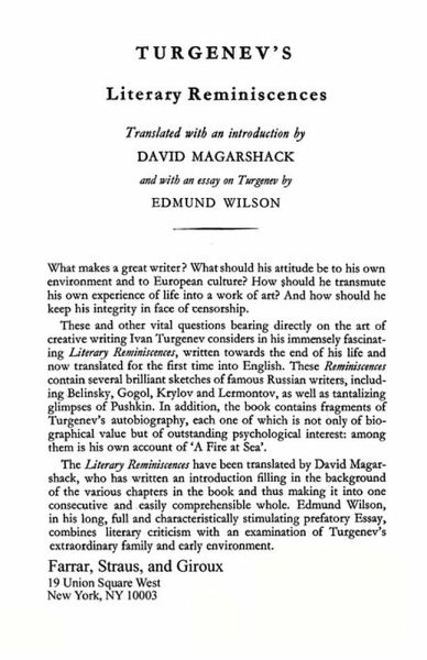 What makes a great writer? What should his attitude be to his own environment and to European culture? How should he transmute his own experience of life into a work of art? And how should he keep his integrity in face of censorship. These and other vital questions bearing directly on the art of creative writing Ivan Turgenev considers in his immensely fascinating Literary Reminiscences, towards the end of his life and now translated for the first time into English. These Reminiscences contain several brilliant sketches of famous Russian writers; including Belinsky, Gogol, Krylov and Lermontov, as well as tantalizing glimpses of Pushkin. In addition, the book contains fragments of Turgenev's autobiography, each one of which is not only of biographical value but of outstanding psychological interest among them is his own account of A Fire at Sea'. The Literary Reminiscences have been translated by David Magarshack, who has written an introduction filling in the of the various in the book and thus making it into one conservative and casily comprehensible whole. Edmund Wilson, in his long, full and characteristically stimulating prefatory Essay, combines literary criticism with an examination of Turgenev's extraordinary family and early environment.