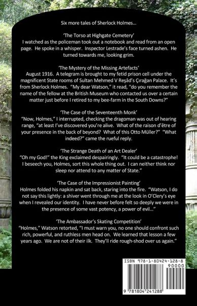 Six more tales of Sherlock Holmes... 'The Torso At Highgate Cemetery' I watched as the policeman took out a notebook and read from an open page. He spoke in a whisper. Inspector Lestrade's face turned ashen. He turned towards me, looking grim. 'The Mystery Of the Missing Artefacts' August 1916. A telegram is brought to my fetid prison cell under the magnificent State rooms of Sultan Mehmed V Re¿âd's Ç¿räan Palace. It's from Sherlock Holmes. "My dear Watson," it read, "do you remember the name of the fellow at the British Museum who contacted us over a certain matter just before I retired to my bee-farm in the South Downs?" 'The Case of the Seventeenth Monk' "Now, Holmes," I interrupted, checking the dragoman was out of hearing range, "at least I've discovered you're alive. What of the raison d'être of your presence in the back of beyond? What of this Otto Müller?" "What indeed?" came the rueful reply. 'The Strange Death of an Art Dealer' "Oh my God!" he exclaimed despairingly. "It could be a catastrophe! I beseech you, Holmes, sort this whole thing out. I can neither think nor sleep nor attend to any matter of State." 'The Case of the Impressionist Painting' Holmes folded his napkin and sat back, staring into the fire. "Watson, I do not say this lightly: a shiver went through me at the look in O'Clery's eye when I revealed our identity. I have never before felt so deeply we were in the presence of some vast potency, a power of evil..." 'The Ambassador's Skating Competition' "Holmes," Watson retorted, "I must warn you, no one should confront such rich, powerful, and ruthless men head on. We learned that lesson a few years ago. We are not of their ilk. They'll ride rough-shod over us again."