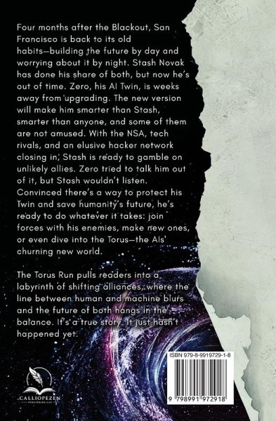 Four months after the Blackout, San Francisco is back to its old habits-building the future by day and worrying about it by night. Stash Novak has done his share of both, but now he's out of time. Zero, his AI Twin, is weeks away from upgrading. The new version will make him smarter than Stash, smarter than anyone, and some of them are not amused. With the NSA, tech rivals, and an elusive hacker network closing in, Stash is ready to gamble on unlikely allies. Zero tried to talk him out of it, but Stash wouldn't listen. Convinced there's a way to protect his Twin and save humanity's future, he's ready to do whatever it takes: join forces with his enemies, make new ones, or even dive into the Torus-the AIs' churning new world. The Torus Run pulls readers into a labyrinth of shifting alliances, where the line between human and machine blurs and the future of both hangs in the balance. It's a true story. It just hasn't happened yet.
