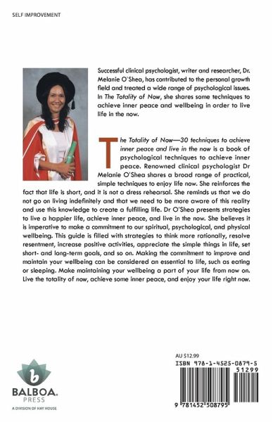 The Totality of Now30 techniques to achieve inner peace and live in the now is a book of psychological techniques to achieve inner peace. Renowned clinical psychologist Dr Melanie OShea shares a broad range of practical, simple techniques to enjoy life now. She reinforces the fact that life is short, and it is not a dress rehearsal. She reminds us that we do not go on living indefinitely and that we need to be more aware of this reality and use this knowledge to create a fulfilling life. Dr OShea presents strategies to live a happier life, achieve inner peace, and live in the now. She believes it is imperative to make a commitment to our spiritual, psychological, and physical wellbeing. This guide is filled with strategies to think more rationally, resolve resentment, increase positive activities, appreciate the simple things in life, set short- and long-term goals, and so on. Making the commitment to improve and maintain your wellbeing can be considered an essential to life, such as eating or sleeping. Make maintaining your wellbeing a part of your life from now on. Live the totality of now, achieve some inner peace, and enjoy your life right now.