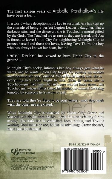 The first sixteen years of Arabella Penthallow's life have been a lie... In a world where deception is the key to survival, Ara has kept up the charade of being a perfect Legion Leader's daughter. But a darkness stirs, and she discovers she is Touched, a mortal gifted by the Gods. The Touched are as rare as they are feared, and Ara is forced to leave Union City for neighboring Midnight City to protect herself and those she loves, leaving Tove Thorn, the boy who has always known her heart, behind. Carter Decker has vowed to burn Union City to the ground... Midnight City's cocky, infamous bad boy always gets what he wants, and he wants Union City to pay for burning his mother alive because she was Touched. When Carter meets Ara, she is everything he's been taught to hate. Then he learns she is Touched-just like him-he isn't sure who he hates more...the Touched girl whose father killed his mother, or himself for being tempted by someone he's sworn to kill. They are told they're fated to be soul mates...and they each wish the other never existed. When Midnight City is attacked by Union City, Carter and Arabella will do the unthinkable...even if it means falling for the enemy. The truth lies in Arabella's home nation, and Tove is waiting. Soul mates or not, he has an advantage Carter doesn't, fated souls be damned. War is coming...and Ara is the prize.