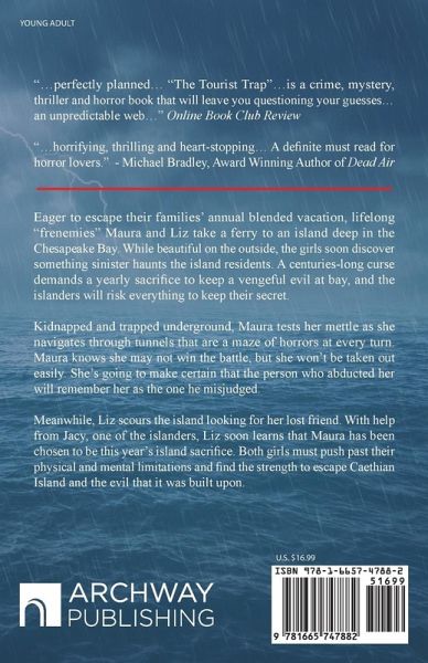 Eager to escape their families' annual blended vacation, lifelong "frenemies" Maura and Liz take a ferry to an island deep in the Chesapeake Bay. While beautiful on the outside, the girls soon discover something sinister haunts the island residents. A centuries-long curse demands a yearly sacrifice to keep a vengeful evil at bay, and the islanders will risk everything to keep their secret. Kidnapped and trapped underground, Maura tests her mettle as she navigates through tunnels that are a maze of horrors at every turn. Maura knows she may not win the battle, but she won't be taken out easily. She's going to make certain that the person who abducted her will remember her as the one he misjudged. Meanwhile, Liz scours the island looking for her lost friend. With help from Jacy, one of the islanders, Liz soon learns that Maura has been chosen to be this year's island sacrifice. Both girls must push past their physical and mental limitations and find the strength to escape Caethian Island and the evil that it was built upon. "...perfectly planned... "The Tourist Trap"...is a crime, mystery, thriller and horror book that will leave you questioning your guesses...an unpredictable web..." Online Book Club Review "...horrifying, thrilling and heart-stopping... A definite must read for horror lovers." - Michael Bradley, Award Winning Author of Dead Air