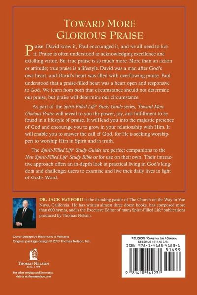 Praise: David knew it, Paul encouraged it, and we all need to live it. Praise is often understood as acknowledging excellence and extolling virtue. But true praise is so much more. More than an action or attitude; true praise is a lifestyle. David was a man after God's own heart, and David's heart was filled with overflowing praise. Paul understood that a praise-filled heart was a heart open and responsive to God. We learn from both that circumstance should not determine our praise, but praise will determine our circumstance. As part of the Spirit-Filled Life(R) Study Guide series, Toward More Glorious Praise will reveal to readers the power, joy, and fulfillment to be found in a lifestyle of praise. It will lead them into the majestic presence of God and encourage them to grow in their relationship with Him. It will enable them to answer the call of God, for He is seeking worshippers to worship Him in Spirit and in truth. The Spirit-Filled Life(R) Study Guides are perfect companions to the New Spirit-Filled Life(R) Study Bible or for use on their own. Their interactive approach offers an in-depth look at practical living in God's kingdom and challenges users to examine and live their daily lives in light of God's Word. Features inlcude: 12 lessons, plus an introduction to experiencing the life of praise Foundational, practical helps like Kingdom Keys, Kingdom Life, and Word Wealth in each lesson