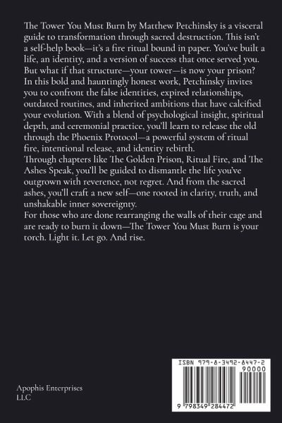 The Tower You Must Burn by Matthew Petchinsky is a visceral guide to transformation through sacred destruction. This isn't a self-help book-it's a fire ritual bound in paper. You've built a life, an identity, and a version of success that once served you. But what if that structure-your tower-is now your prison? In this bold and hauntingly honest work, Petchinsky invites you to confront the false identities, expired relationships, outdated routines, and inherited ambitions that have calcified your evolution. With a blend of psychological insight, spiritual depth, and ceremonial practice, you'll learn to release the old through the Phoenix Protocol-a powerful system of ritual fire, intentional release, and identity rebirth. Through chapters like The Golden Prison, Ritual Fire, and The Ashes Speak, you'll be guided to dismantle the life you've outgrown with reverence, not regret. And from the sacred ashes, you'll craft a new self-one rooted in clarity, truth, and unshakable inner sovereignty. For those who are done rearranging the walls of their cage and are ready to burn it down-The Tower You Must Burn is your torch. Light it. Let go. And rise.