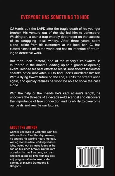 CJ Harris quit the LAPD after the tragic death of his younger brother. His venture out of the city led him to Jonesboro, Washington, a tourist trap entirely dependent on the success of its struggling local winery. After three years spent alone-aside from his customers at the local bar-CJ has closed himself off to the world and has no intention of returning to detective work. But then Jack Romero, one of the winery's co-owners, is murdered in the months leading up to a grand re-opening event. Despite his best efforts to resist, Jonesboro's lackluster sheriff's office motivates CJ to find Jack's murderer himself. With a dying town's future on the line, CJ hits the streets once again, and quickly realizes he won't be able to solve the case alone. With the help of the friends he's kept at arm's length, he uncovers the threads of a decades-old scandal and discovers the importance of true connection and its ability to overcome our pasts and rewrite our futures.