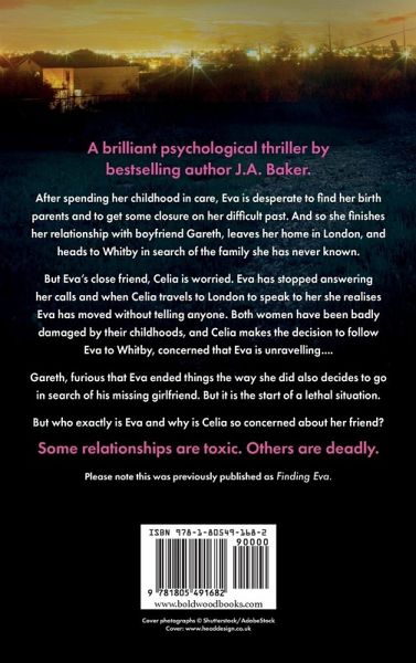 A brilliant psychological thriller by bestselling author J.A. Baker... After spending her childhood in care, Eva is desperate to find her birth parents and to get some closure on her difficult past. And so she finishes her relationship with boyfriend Gareth, leaves her home in London, and heads to Whitby in search of the family she has never known. But Eva's close friend, Celia is worried. Eva has stopped answering her calls and when Celia travels to London to speak to her she realises Eva has moved without telling anyone. Both women have been badly damaged by their childhoods, and Celia makes the decision to follow Eva to Whitby, concerned that Eva is unravelling.... Gareth, furious that Eva ended things the way she did also decides to go in search of his missing girlfriend. But it is the start of a lethal situation. But who exactly is Eva and why is Celia so concerned about her friend? Some relationships are toxic. Others are deadly. **Perfect for fans of Sue Watson, Valerie Keogh and K.L. Slater. What people are saying about J.A. Baker...** 'Superbly written with a cast of crazy characters who will make you look differently at your co-workers from now on.' Bestselling author Valerie Keogh 'Fast-paced, riveting thriller. Gripped until the last page!' Bestselling author Diana Wilkinson 'I read this story in a single day. Once you begin, it's difficult to put it down. 5 stars from me!' Bestselling author L.H. Stacey 'A twisty, creepy story, expertly told. Perfect for reading on dark winter evenings...with the doors double-locked and bolted. Highly recommended!' Bestselling author Amanda James Please note this book was previously published as Finding Eva