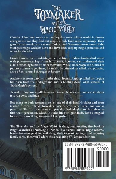 Cousins Liam and Anna are two regular teens whose world is forever changed the day they find out magic is real. Even more surprising? Their grandparents-who are a master Builder and Seamstress-are some of the strongest magic wielders alive and have been keeping magic protected and secret for decades. Liam's furious that TradeMagic-an ability to imbue handcrafted wares with powers-was kept from him. Anna, however, can understand their elder's reasoning to hide it from the world. While TradeMagic can be used to promote immense goodness, it can also be misused for selfish, evil pursuits, as so often occurred throughout history. And now, it seems another similar threat looms. A group called the Legion has risen from the underground and is hunting down what remains of TradeMagic's powers. To make things worse, all Liam's and Anna's elders seem to want to do about it is run away and hide. But much to both teenagers' relief, one of their family's oldest and most trusted friends, retired Toymaker Fritz Schenk, sees Liam's and Anna's potential. The Toymaker wants to pass the TradeMagical torch to them so that their generation, which includes his own grandkids, have a magical future that's worth fighting-and living-for. The Toymaker and the Magic Within is the groundbreaking first book in Birgit Schreiber's TradeMagic¿ Series. If you crave unique magic systems, battles between good and evil, enduring family sagas, and found family and friends, then you'll adore this enchanting YA fantasy adventure.