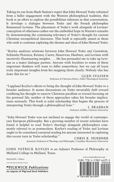 Taking its cue from Mark Nation's regret that John Howard Yoder refrained from a fuller engagement with the Western philosophical tradition, this book is an effort to explore the possibilities inherent in that conversation. It develops a dialogue between Yoder and the French philosopher Emmanuel Levinas. The placement of Yoder's work alongside of Levinas' conception of otherness cashes out the embedded hope in Nation's remarks by demonstrating the continuing relevancy of Yoder's thought for current Christian sociopolitical discourse. This book is especially aimed at those who seek to continue exploring the themes and ideas of John Howard Yoder.