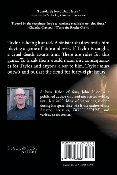 Horror Talk "Top 10 Horror Novels of 2018" "I never want to hear mention of bolt-cutters, a live rat and a bucket in the same sentence again. EVER." -Ginger Nuts of Horror "John Hunt is the author to watch in the horror and suspense genre." -The Novel Pursuit Trapped in a twisted game of cat and mouse, Taylor must play by the rules of the inhuman nightmare that's hunting him down - or else face a cruel and dire fate... A pulse-pounding chiller! Taylor is being hunted. A sinister shadow trails him playing a game of hide and seek. If Taylor is caught, a cruel death awaits him. There are rules for this game. To break them would mean dire consequences for Taylor and anyone close to him. Taylor must outwit and outlast the fiend for forty-eight hours.