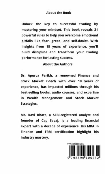 Unlock the Hidden Key to Trading Success: Your Mindset In the fast-paced world of trading, success isn't just about market strategies or mastering technical analysis-it's about mastering yourself. In "The Trader's Mindset: 21 Rules to Master Your Psychology and Win in the Trading Game", seasoned traders Apurva Parikh and Ravi Bhatt share their hard-earned wisdom from decades of navigating the highs and lows of the markets. Have you ever made emotional trades driven by fear, greed, or impatience? You're not alone. Most traders struggle not because they lack knowledge, but because they fail to manage their emotions. This book sheds light on psychology's critical role in trading and gives you 21 practical rules to help you develop a winning mindset. Each chapter is packed with real-life examples, actionable insights, and proven strategies to help you overcome common psychological pitfalls. Whether you're a beginner or a seasoned pro, these rules will serve as your roadmap to mastering the mental side of trading. Discover how to stay disciplined, manage risk effectively, and avoid emotional traps that can ruin even the best trades. With this guide, you'll learn to stay calm under pressure, trust your decisions, and most importantly, trade confidently. If you're ready to elevate your trading game and achieve consistent success, "The Trader's Mindset" is your essential guide. Get ready to transform your mindset and win the trading game!