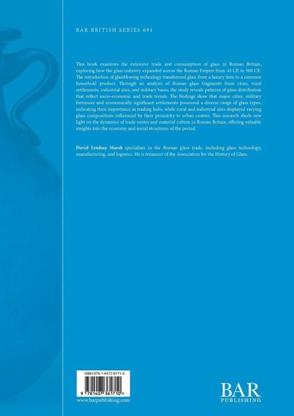 This book examines the extensive trade and consumption of glass in Roman Britain, exploring how the glass industry expanded across the Roman Empire from 43 CE to 500 CE. The introduction of glassblowing technology transformed glass from a luxury item to a common household product. Through an analysis of Roman glass fragments from cities, rural settlements, industrial sites, and military bases, the study reveals patterns of glass distribution that reflect socio-economic and trade trends. The findings show that major cities, military fortresses and economically significant settlements possessed a diverse range of glass types, indicating their importance as trading hubs, while rural and industrial sites displayed varying glass compositions influenced by their proximity to urban centres. This research sheds new light on the dynamics of trade routes and material culture in Roman Britain, offering valuable insights into the economy and social structures of the period.