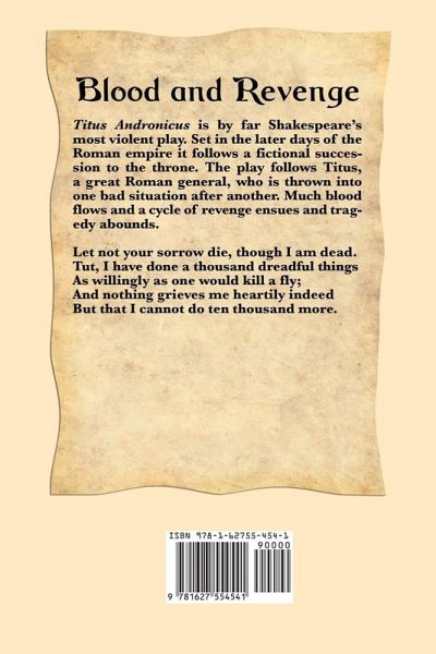 Blood and Revenge-- Titus Andronicus is by far Shakespeare's most violent play. Set in the later days of the Roman empire it follows a fictional succession to the throne. The play follows Titus, a great Roman general, who is thrown into one bad situation after another. Much blood flows and a cycle of revenge ensues and tragedy abounds. Let not your sorrow die, though I am dead. Tut, I have done a thousand dreadful things As willingly as one would kill a fly; And nothing grieves me heartily indeed But that I cannot do ten thousand more.