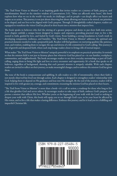 "The Trail From Vision to Mission" is an inspiring guide that invites readers on a journey of faith, purpose, and transformation. Based on the timeless wisdom of Lamentations 3:51, "Mine eye affecteth mine heart," this book explores how what we see in the world-its needs, its challenges, and its people-can deeply affect our hearts and inspire us to action. This journey is not just about observing but about allowing our hearts to be stirred, our priorities to be shaped, and our lives to be aligned with God's purpose. Through 25 thoughtfully crafted chapters, readers are equipped to transform the vision God has placed in their hearts into a mission that impacts lives. The book speaks to believers who feel the stirring of a greater purpose and desire to put their faith into action. Each chapter unfolds a unique lesson designed to inspire and empower, providing practical steps to live a life rooted in faith, guided by love, and fueled by God's vision. From building a strong foundation in God's truth to developing compassion, resilience, and humility, "The Trail From Vision to Mission" addresses the spiritual and practical elements needed to walk a purposeful path. Readers will find guidance on nurturing qualities like patience, trust, and wisdom, enabling them to navigate the ups and downs of a life committed to God's calling. This journey is one of growth and deepened faith, where each step brings readers closer to living a life of eternal impact. What makes "The Trail From Vision to Mission" uniquely powerful is its emphasis on practical spirituality. It reminds us that the mission field is not just in faraway places but wherever God has placed us-in our families, workplaces, communities, and neighborhoods. The book encourages readers to see their everyday surroundings as part of God's calling, urging them to bring His light and love to every encounter and opportunity. It's a book that speaks to all believers, regardless of background, showing that each person's mission is uniquely valuable. With each chapter, readers are invited to reflect on their journey, to make meaningful changes, and to embrace the mission God has given them. The tone of the book is compassionate and uplifting. It calls readers to a life of intentionality, where their faith is not merely observed but lived out through action. Each chapter is designed to strengthen readers' relationship with God, helping them to depend on His guidance and lean into His strength. By the end of the journey, readers will be inspired to live with greater joy, courage, and commitment, treasuring the mission God has placed on their hearts. "The Trail From Vision to Mission" is more than a book-it's a call to action, a roadmap for those who long to live a life that glorifies God and serves others. It encourages readers to take steps of faith, embrace God's purpose, and pursue a mission that reflects His love. Whether you're at the beginning of your walk with the Lord or seeking to deepen your walk with Christ, this book will equip you to see through God's eyes, to let your heart be affected by His vision, and to live a life that makes a lasting difference. Embrace this journey and let it lead you to a fulfilling and impactful Christian life.