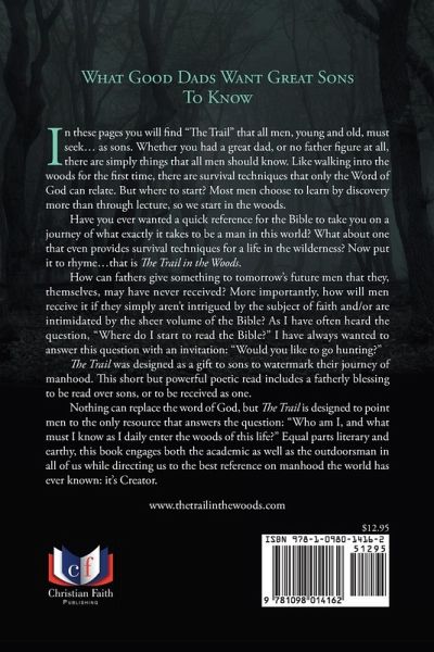 What Good Dads Want Great Sons To Know In these pages you will find "The Trail" that all men, young and old, must seek... as sons. Whether you had a great dad, or no father figure at all, there are simply things that all men should know. Like walking into the woods for the first time, there are survival techniques that only the Word of God can relate. But where to start? Most men choose to learn by discovery more than through lecture, so we start in the woods. Have you ever wanted a quick reference for the Bible to take you on a journey of what exactly it takes to be a man in this world? What about one that even provides survival techniques for a life in the wilderness? Now put it to rhyme...that is The Trail in the Woods. How can fathers give something to tomorrow's future men that they, themselves, may have never received? More importantly, how will men receive it if they simply aren't intrigued by the subject of faith and/or are intimidated by the sheer volume of the Bible? As I have often heard the question, "Where do I start to read the Bible?" I have always wanted to answer this question with an invitation: "Would you like to go hunting?" The Trail was designed as a gift to sons to watermark their journey of manhood. This short but powerful poetic read includes a fatherly blessing to be read over sons, or to be received as one. Nothing can replace the word of God, but The Trail is designed to point men to the only resource that answers the question: "Who am I, and what must I know as I daily enter the woods of this life?" Equal parts literary and earthy, this book engages both the academic as well as the outdoorsman in all of us while directing us to the best reference on manhood the world has ever known: it's Creator. www.thetrailinthewoods.com