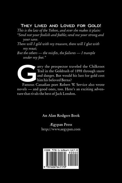 Coming from all over the country, the fortune seekers gather in San Francisco and board a ship for Alaska, unaware of the many hardships that they will face out in the unforgiving wilderness, such as blizzards, floods and fires. Famous Canadian poet Robert W. Service also wrote novels -- and good ones, too. Here's an exciting adventure that rivals the best of Jack London. THEY LIVED AND LOVED FOR GOLD! This is the law of the Yukon, and ever she makes it plain: "Send not your foolish and feeble; send me your strong and your sane. Them will I gild with my treasure, them will I glut with my meat; But the others -- the misfits, the failures -- I trample under my feet." Garry the prospector traveled the Chilkroot Trail in the Goldrush of 1898 through snow and danger. But would his lust for gold cost him his beloved Berna?