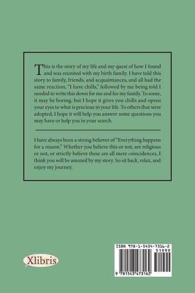 This is the story of my life and my quest of how I found and was reunited with my birth family. I have told this story to family, friends, and acquaintances, and all had the same reaction, I have chills, followed by me being told I needed to write this down for me and for my family. To some, it may be boring, but I hope it gives you chills and opens your eyes to what is precious in your life. To others that were adopted, I hope it will help you answer some questions you may have or help you in your search.