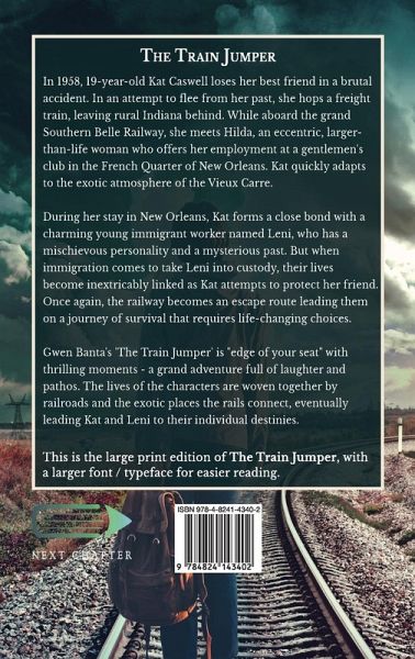 In 1958, 19-year-old Kat Caswell loses her best friend in a brutal accident. In an attempt to flee from her past, she hops a freight train, leaving rural Indiana behind. Kat soon discovers that the extreme danger of train jumping is a welcome distraction from her pain. While aboard the grand Southern Belle Railway, she meets Hilda, an eccentric, larger-than-life woman who offers her employment at a gentlemen's club in the French Quarter of New Orleans. Kat quickly adapts to the exotic atmosphere of the Vieux Carre. During her stay in New Orleans, Kat forms a close bond with a charming young immigrant worker named Leni, who has a mischievous personality and a mysterious past. Each girl thrives in the lively environment full of colorful patrons. But when immigration comes to take Leni into custody, their lives become inextricably linked as Kat attempts to protect her friend. Once again, the railway becomes an escape route leading them on a journey of survival that requires life-changing choices. Gwen Banta's 'The Train Jumper' is "edge of your seat" with thrilling moments - a grand adventure full of laughter and pathos. The lives of the characters are woven together by railroads and the exotic places the rails connect, eventually leading Kat and Leni to their individual destinies. This is the large print edition of The Train Jumper, with a larger font / typeface for easier reading.