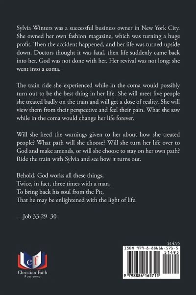 Sylvia Winters was a successful business owner in New York City. She owned her own fashion magazine, which was turning a huge profit. Then the accident happened, and her life was turned upside down. Doctors thought it was fatal, then life suddenly came back into her. God was not done with her. Her revival was not long; she went into a coma. The train ride she experienced while in the coma would possibly turn out to be the best thing in her life. She will meet five people she treated badly on the train and will get a dose of reality. She will view them from their perspective and feel their pain. What she saw while in the coma would change her life forever. Will she heed the warnings given to her about how she treated people? What path will she choose? Will she turn her life over to God and make amends, or will she choose to stay on her own path? Ride the train with Sylvia and see how it turns out. Behold, God works all these things, Twice, in fact, three times with a man, To bring back his soul from the Pit, That he may be enlightened with the light of life. -Job 33:29-30
