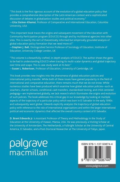 This book provides new insights into the phenomena of global education policies and international policy transfer. While both of these issues have gained popularity in the field of international and comparative education, there remains much that we do not know. In particular, while numerous studies have been produced which examine how global education policies-such as vouchers, charter schools, conditional-cash transfers, standardized testing, child-centered pedagogy, etc.-are implemented globally, we lack research which illuminates the origins and evolution of such policies. The book addresses this critical gap in our knowledge by looking at multiple aspects of the trajectory of a particular policy which was born in El Salvador in the early 1990s and subsequently went global. Edwards explicitly analyzes the trajectory of global education policy with reference to the role of international organizations and within the larger international political and economic dynamics that affected the overall country context of El Salvador.