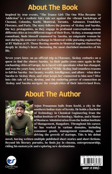 Inspired by true events, "The Trance Girl: The One Who Became An Addiction" is a realistic fairy tale set against the vibrant backdrops of Chennai, Colombo, Kochi, Montreal, Toronto, Aalsmeer, Frankfurt, Florence, and Paris. The story follows the journey of Akshay and Saesha, the key protagonists, as they engage in profound conversations across different cities at two different stages of their lives. Akshay, a management consultant, finds himself enamored by Saesha, an enigmatic woman he met during his semester exchange in Montreal while pursuing engineering at IIT Madras at 19. Those fleeting months in Montreal imprint themselves deeply in Akshay's heart, becoming the most cherished memories of his life. Seven years later, on an official trip to Florence, Akshay embarks on a quest to find the elusive Saesha. As their paths cross once again in the enchanting cities of Europe, he is faced with questions: what has changed, and was the years-long wait worth it? While Akshay had countless reasons to fall for Saesha-her beauty, wealth, intelligence, and allure-what drew Saesha to Akshay then, and what keeps her connected to him now? Dive into this tale of love, destiny, and the enduring power of connection as Akshay and Saesha navigate the complexities of their intertwined lives.
