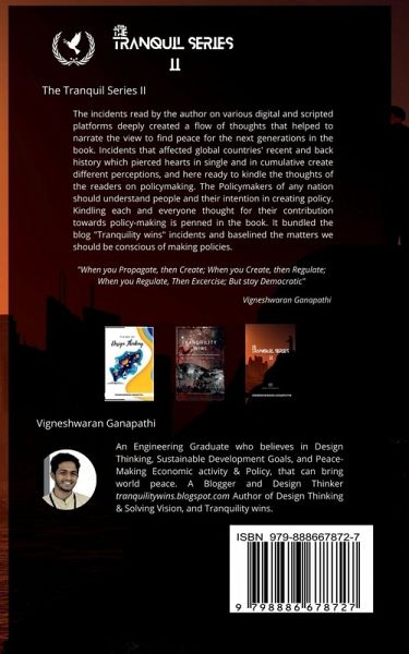 The incidents read by the author on various digital and scripted platforms deeply created a flow of thoughts that helped to narrate the view to find peace for the next generations in the book. Incidents that affected global countries' recent and back history which pierced hearts in single and in cumulative create different perceptions, and here ready to kindle the thoughts of the readers on policymaking. The Policymakers of any nation should understand people and their intention in creating policy. Kindling each and everyone thought for their contribution towards policy-making is penned in the book. It bundled the blog ""Tranquility wins"" incidents and baselined the matters we should be conscious of making policies. ""When you Propagate, then Create; When you Create, then Regulate;When you Regulate, Then Excercise; But stay Democratic"" Vigneshwaran Ganapathi