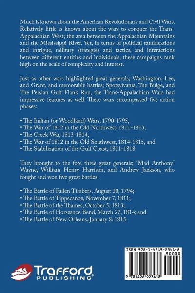 Much is known about the American Revolutionary and Civil Wars. Relatively little is known about the wars to conquer the Trans-Appalachian West; the area between the Appalachian Mountains and the Mississippi River. Yet, in terms of political ramifications and intrigue, military strategies and tactics, and interactions between different entities and individuals, these campaigns rank high on the scale of complexity and interest. Just as other wars highlighted great generals; Washington, Lee, and Grant, and memorable battles; Spotsylvania, The Bulge, and The Persian Gulf Flank Run, the Trans-Appalachian Wars had impressive features as well. These wars encompassed the five action phases: ¿ The Indian (or Woodland) Wars, 1790-1795, ¿ The War of 1812 in the Old Northwest, 1811-1813, ¿ The Creek War, 1813-1814, ¿ The War of 1812 in the Old Southwest, 1814-1815, and ¿ The Stabilization of the Gulf Coast, 1811-1818. They brought to the fore three great generals; "Mad Anthony" Wayne, William Henry Harrison, and Andrew Jackson, who fought and won five great battles: ¿ The Battle of Fallen Timbers, August 20, 1794; ¿ The Battle of Tippecanoe, November 7, 1811; ¿ The Battle of the Thames, October 8, 1813; ¿ The Battle of Horseshoe Bend, March 27, 1814; and ¿ The Battle of New Orleans, January 8, 1815.