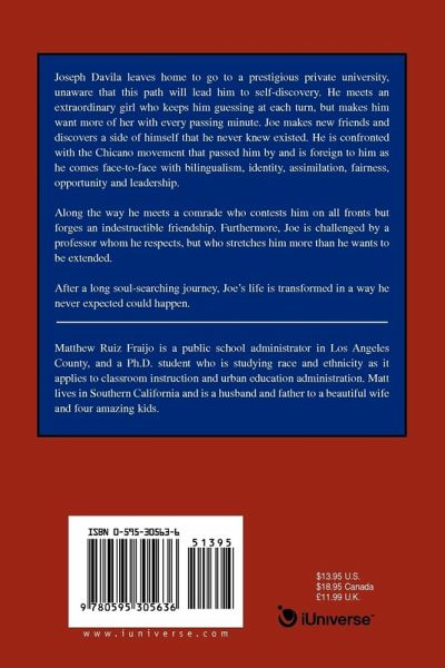 Joseph Davila leaves home to go to a prestigious private university, unaware that this path will lead him to self-discovery. He meets an extraordinary girl who keeps him guessing at each turn, but makes him want more of her with every passing minute. Joe makes new friends and discovers a side of himself that he never knew existed. He is confronted with the Chicano movement that passed him by and is foreign to him as he comes face-to-face with bilingualism, identity, assimilation, fairness, opportunity and leadership. Along the way he meets a comrade who contests him on all fronts but forges an…mehr